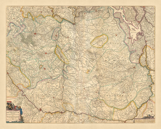 The 'Tabula Ducatus Brabantiae continens Marchionatum Sacri Imperii et Dominium Mechliniense' is more than just a map; it's a journey through time, taking you back to the late 17th century. The hand-colored outlines and engraved details showcase the map's meticulous craftsmanship. The relief shown pictorially further enhances the map's visual appeal. Whether you're a history enthusiast, a lover of cartography, or simply someone who appreciates fine art, this map is a treasure trove of historical and geographical insights.