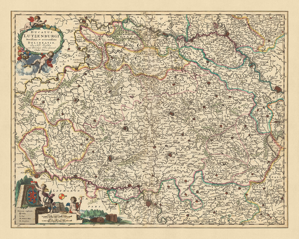 Old Map of Duchy of Luxembourg by Visscher, 1690: Liège, Namur, Metz, Trier, Ardennes Regional Park