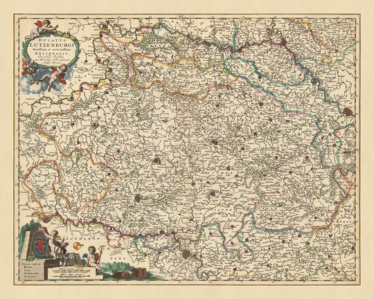 Immerse yourself in the grandeur of the past with this intricately detailed map of the Duchy of Luxembourg, meticulously crafted by Nicolaes Visscher II in 1690. Known as 'Ducatus Lutzenburgi: novissima et accuratissima delineatio', this map showcases the regions and political divisions of the larger modern day area of Luxembourg.