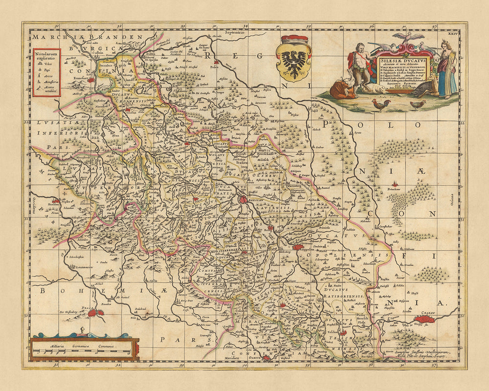 Immerse yourself in the rich history of the Duchy of Silesia with this exquisite map, meticulously crafted by Nicolaes Visscher II in 1690. The map, whose full name 'Silesiae Ducatus Accurata et vera delineatio' translates to 'Accurate and true depiction of the Duchy of Silesia', provides a captivating glimpse into the region's political divisions during the late 17th century. Visscher, a prominent figure in the Dutch Golden Age of cartography, has intricately detailed the various regions within the Duchy, offering a unique perspective on the historical landscape of what is now modern-day Poland and the Czech Republic.