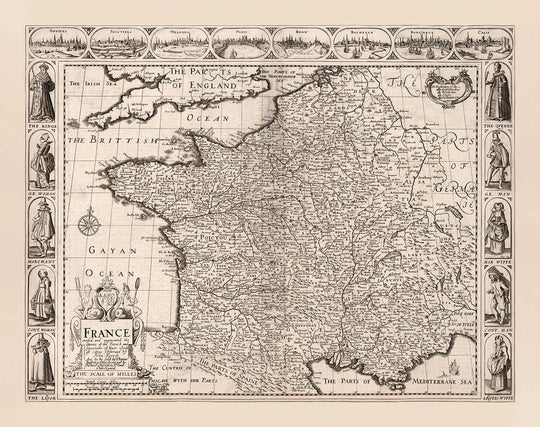 Around the edge of the map are some wonderful engravings of French cities such as Calais, Paris, Bordeaux and Poitiers - and also drawings of the French people, including the King, Queen, 'Gentleman', and 'Merchant'.