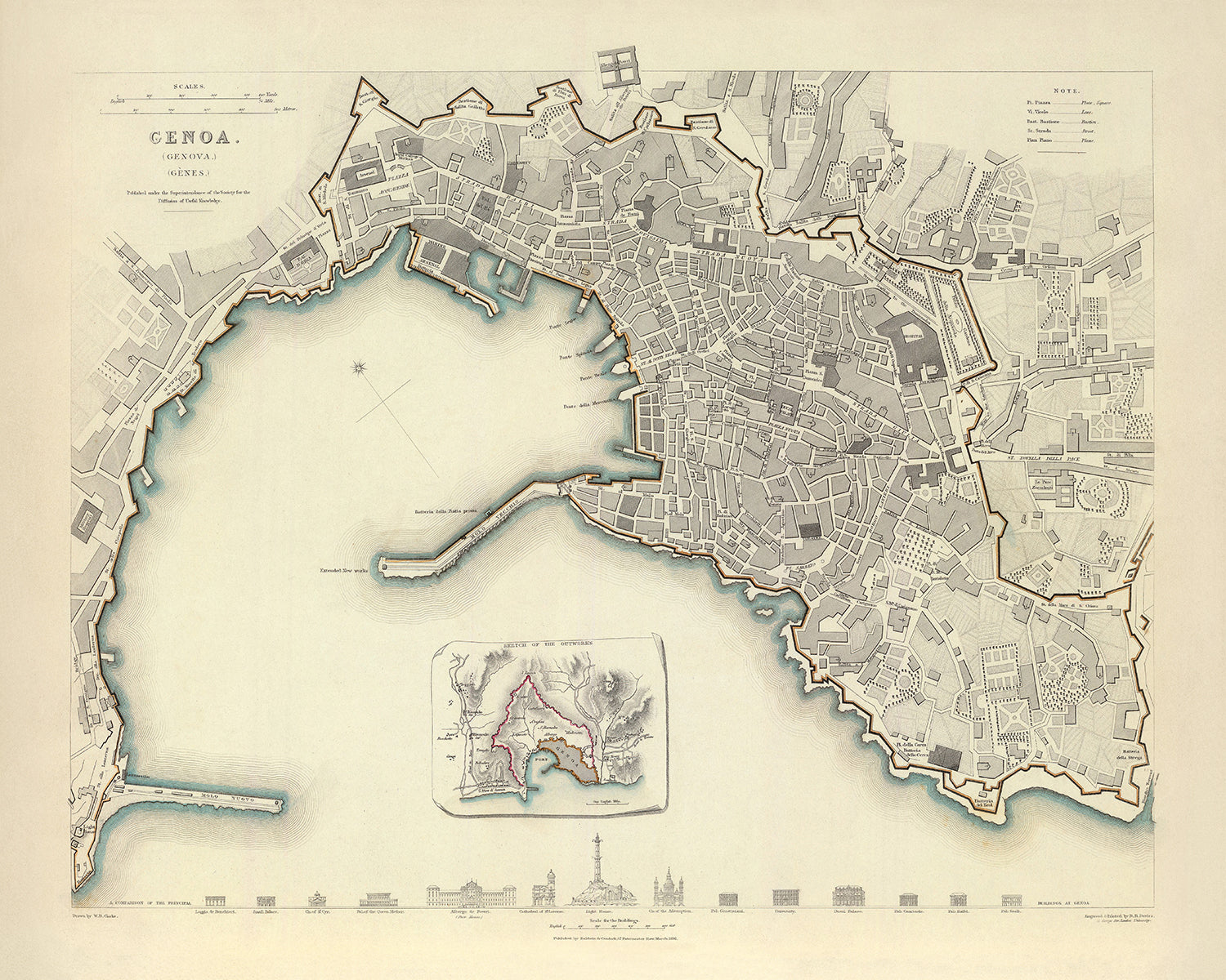 The map's design and style reflect the high standards of 19th-century cartography, with a focus on both utility and aesthetic appeal. The hand-colored engravings and detailed illustrations make this map a true work of art, while its historical significance is underscored by its publication under the auspices of the Society for the Diffusion of Useful Knowledge. This map is not just a navigational tool but a historical document that offers a unique insight into the urban and cultural landscape of Genoa, making it a prized addition to any collection of historical maps.
