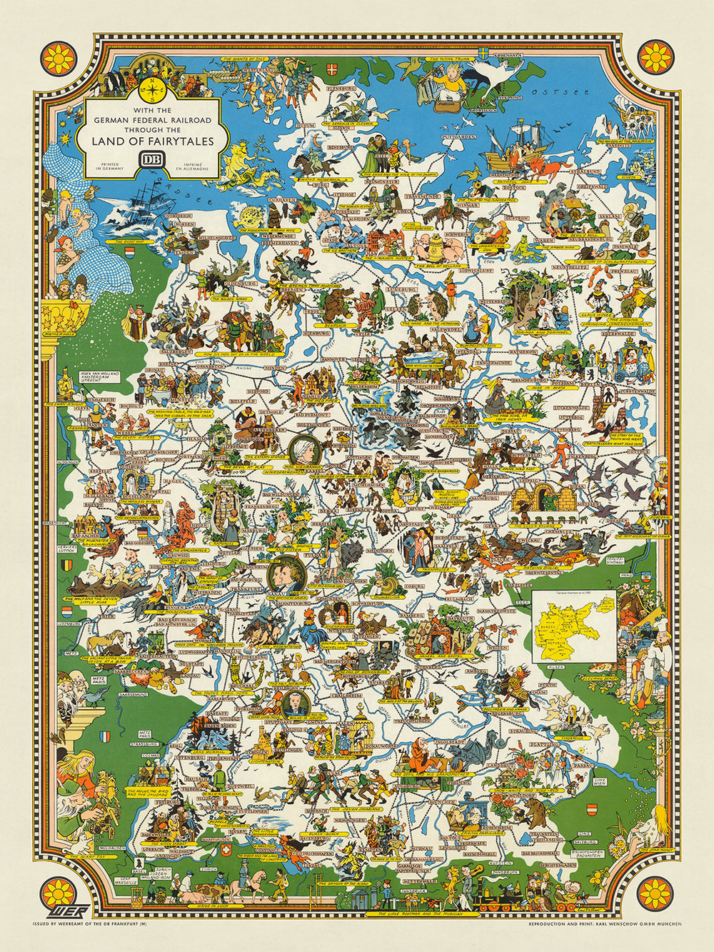 Old Map of German Fairytales, 1960: Little Red Riding Hood, Hansel & Gretel, Grimm Tales, Deutsche Bundesbahn
