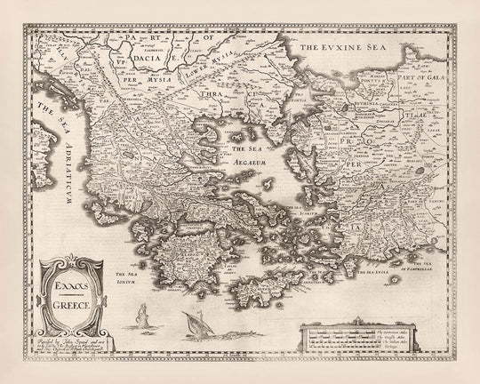 John Speed's map is more than just a geographical representation; it is a historical document that reflects the geopolitical climate of the 17th century. The map illustrates Greece's complex political boundaries and its relationship with neighboring territories, including parts of the Ottoman Empire and the Balkan regions. The detailed depiction of the Aegean, Ionian, and Adriatic Seas, along with the Black Sea, showcases the strategic importance of these waters in trade and cultural exchange.