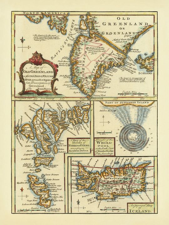 Old Map of Iceland, Faroe Islands & Greenland by Bowen, 1747: Skalholt, Holum, Suðuroy, Davis's Straits, Whirlpool
