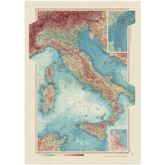 One of the most striking features of the map is the detailed representation of the islands of Corsica, Sardinia, and Sicily. Each island is rendered with a level of precision that captures their unique geographical features and landmarks. The map also highlights the strategic importance of these islands in the Mediterranean, nestled between the Tyrrhenian and Adriatic Seas. The map also features insets of Palermo and Venezia (Venice), offering a closer look at these iconic cities and their intricate urban landscapes.