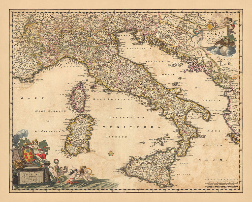 The 'Totius Italiae tabula' is more than just a map; it's a piece of art. It features decorative cartouches, a compass rose, and a dedication text "Serenissimo Principi Cosmo III Magno Etruriae Duci tabulam hanc humillime dedicat Nicolaus Visscher." This roughly translates to "Nicolaus Visscher humbly dedicates this map to the most serene Prince Cosimo III, the Great Duke of Tuscany." This map, with its hand-colored outlines and pictorial relief, serves as a testament to the artistry and craftsmanship of its time, making it a captivating addition to any collection.