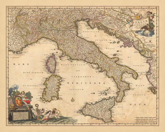 Step back in time with the exquisite 'Totius Italiae tabula', a remarkable cartographic masterpiece by Nicolaes Visscher II, dating back to 1690. Translated to 'Map of All Italy', this artwork captures the entirety of Italy, including the islands of Sardinia, Corsica, Sicily, and the far-reaching area of Croatia. It's a fascinating journey through the past, providing a detailed overview of the political divisions and regions of Italy during a period of immense historical significance.