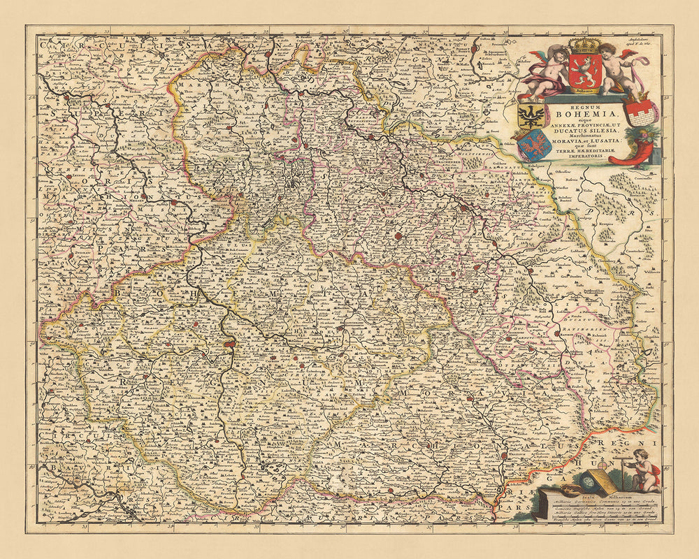 Discover the historical intricacies of the Kingdom of Bohemia, as masterfully captured by Nicolaes Visscher II in 1690. This detailed map, titled 'Regnum Bohemia, eique Annexae Provinciae : Ut Ducatus Silesia, Marchionatus Moravia, et Lusatia: quae sunt Terrae Haereditariae Imperatoris', showcases the grandeur of the region, its political divisions, and the various territories that were under the hereditary rule of the Emperor.