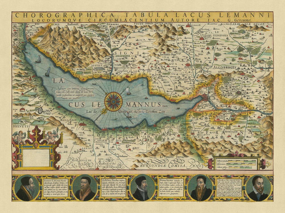 At the heart of this map lies a unique homage to the luminaries of the Protestant Reformation. Portraits of John Calvin, William Farel, Pierre Viret, Theodore Beza, and Simon Goulart adorn its surface, each a testament to the enduring impact of their work and faith. These figures, instrumental in the Reformation's spread through Geneva and beyond, are immortalized in this first state of the map, a feature exclusive to this edition.