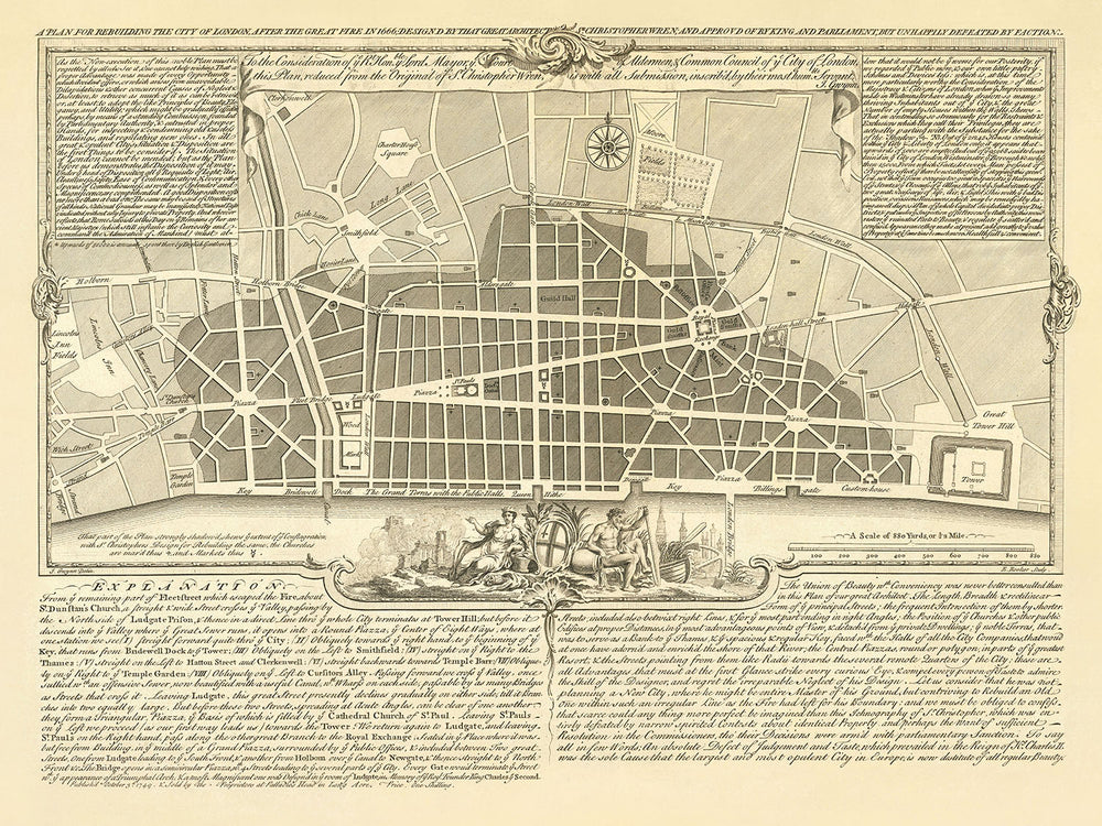 - The map is titled "A Plan For Rebuilding The City of London After The Great Fire in 1666; Design'd By That Great Architect Sr. Christopher Wren; and Approv'd of By King and Parliament, But Unhappily Defeated By Faction."