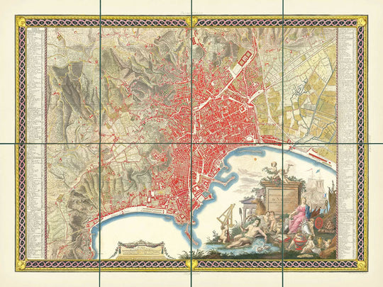 In addition to its geographical features, the map is adorned with a decorative cartouche, featuring maritime elements and allegorical figures that celebrate Naples' rich history and its connection to the sea. This artistic embellishment adds a layer of cultural significance, reflecting the city's status as a vital port and a center of Mediterranean trade and exploration.