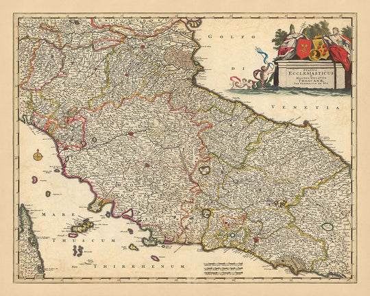Immerse yourself in the grandeur of the past with our meticulously detailed map, 'Status Ecclesiasticus et Magnus Ducatus Thoscanae'. Translated from Latin, the title refers to the 'Ecclesiastical State and Grand Duchy of Tuscany', which is the primary focus of this cartographic masterpiece. Crafted by Nicolaes Visscher II in 1690, this map showcases the political and geographical divisions of the Papal States and the Grand Duchy of Tuscany, regions now part of modern-day Italy. Visscher, a notable figure from the Dutch Golden Age, was the grandson of Claes Janszoon Visscher, renowned for his exquisite mapmaking skills.