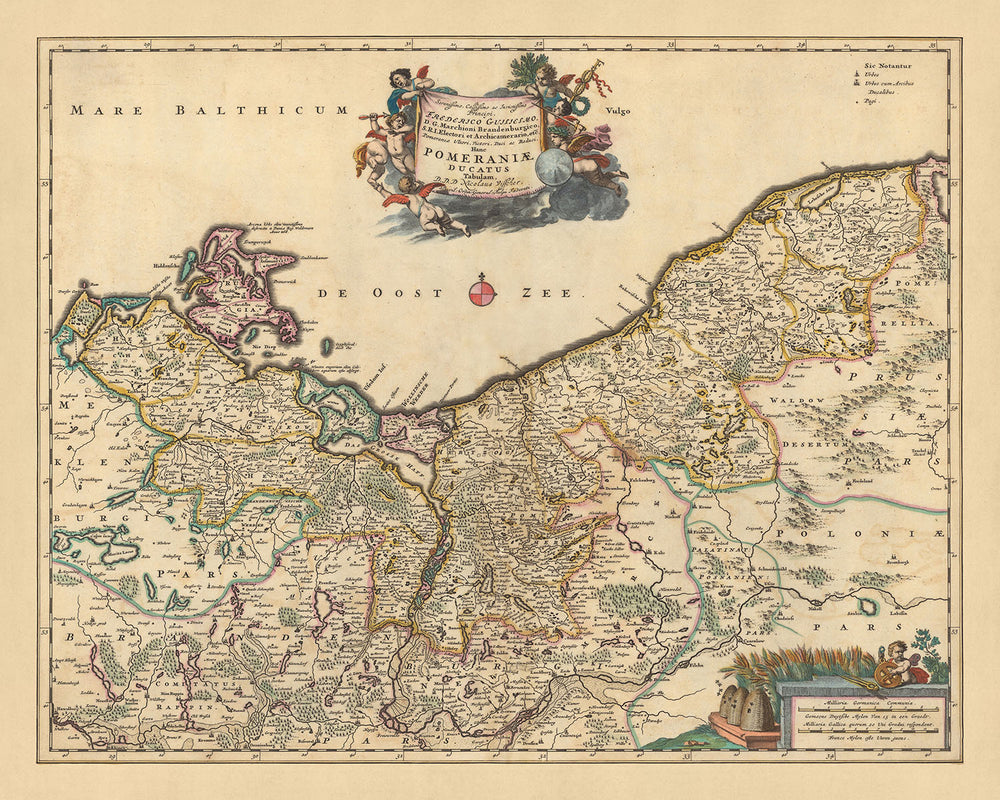 In addition to the cities and natural landscapes, the map also reveals the political boundaries of the Duchy of Pomerania. The division of the region into smaller administrative units, each with its distinct coat of arms, is a compelling feature that underscores the political complexity of the era. The map, thus, not only provides a geographical overview but also serves as a historical document, reflecting the socio-political dynamics of the late 17th century.