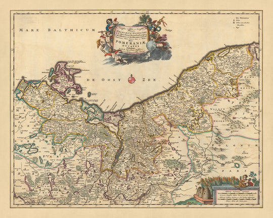 Immerse yourself in the rich tapestry of history with this meticulously detailed map of Pomerania, crafted by the renowned mapmaker Nicolaes Visscher II in 1690. Known as 'Pomeraniae ducatus tabulam' in Latin, the map translates to 'Map of the Duchy of Pomerania', encompassing the area of present-day Poland and Germany. The map offers a fascinating insight into the geographical and political divisions of the time, showcasing the grandeur of the Dutch Golden Age of cartography.