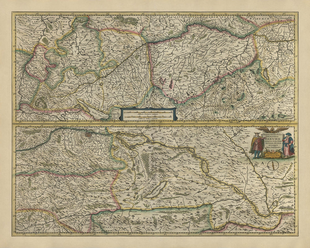 Gerhard Mercator, a name synonymous with precision in mapmaking, was revolutionary in his field. Known for the Mercator projection, his innovative approach allowed sailors to navigate the seas more accurately, changing the course of navigation forever. Together with Jodocus Hondius, who is celebrated for his contributions to the Mercator-Hondius Atlas, one of the seminal atlases of the time, they created maps that were not only functional but also richly detailed and beautifully decorated. Their collaboration brought to life this map of the Danube River basin, showcasing their unparalleled skill in blending scientific precision with artistic elegance.