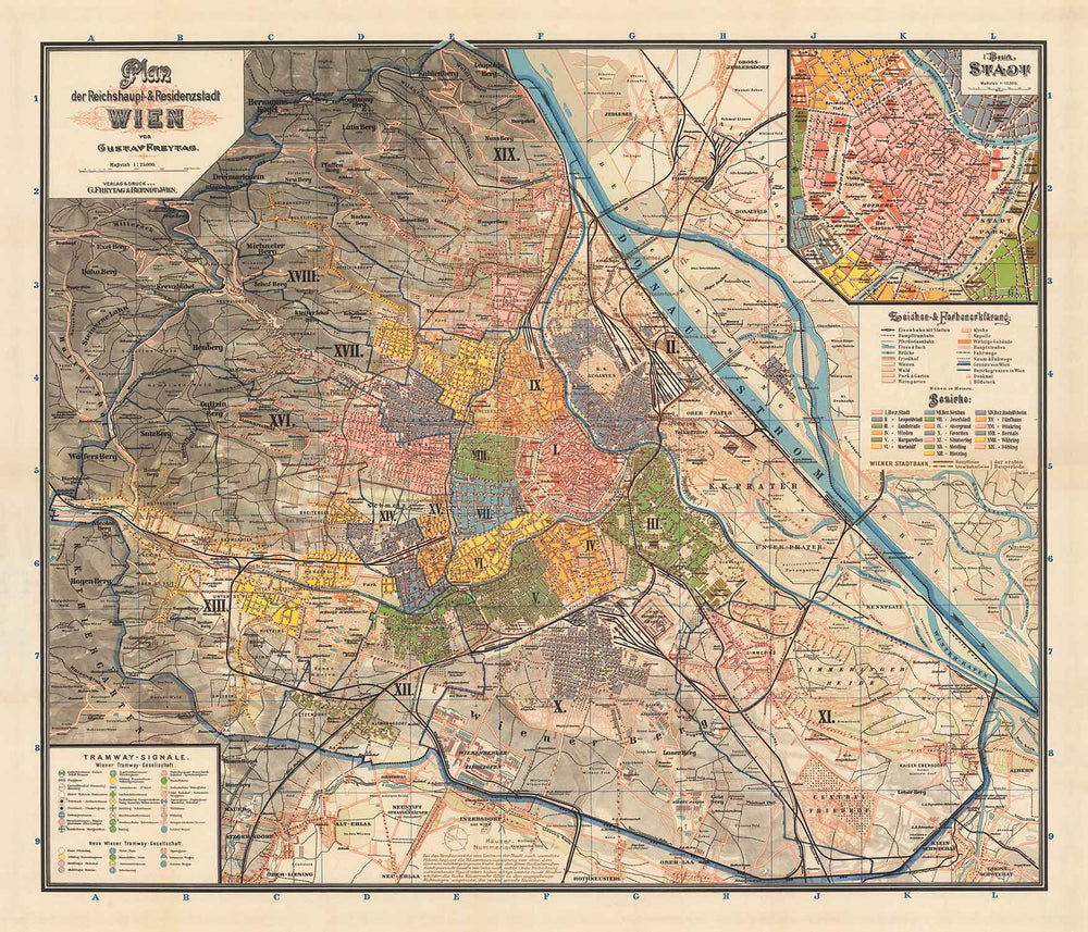 Old Map of Vienna by Gustav Freytag in 1895: Innere Stadt, Leopoldstadt, Wieden, Margareten, Landstraße