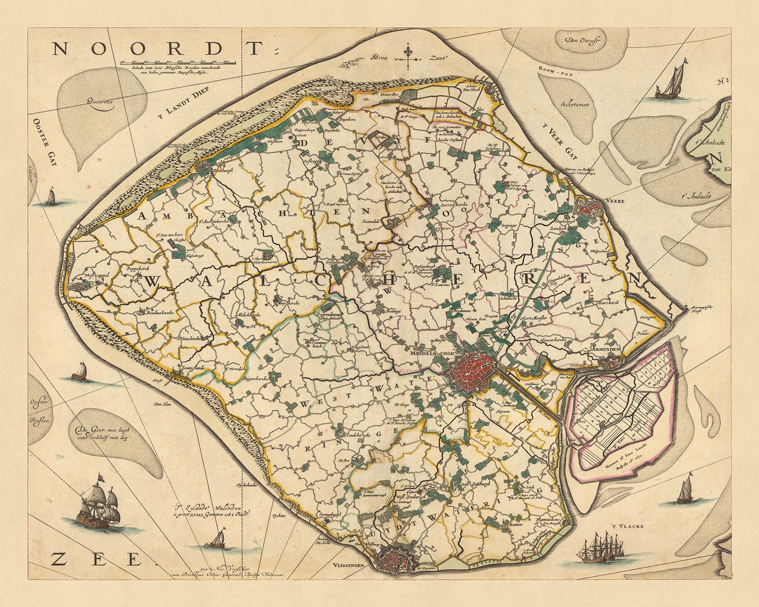 Old Map of Walcheren Island, Zeeland by Visscher, 1690: Middelburg, Vlissingen, Domburg, Veere, Koudekerke