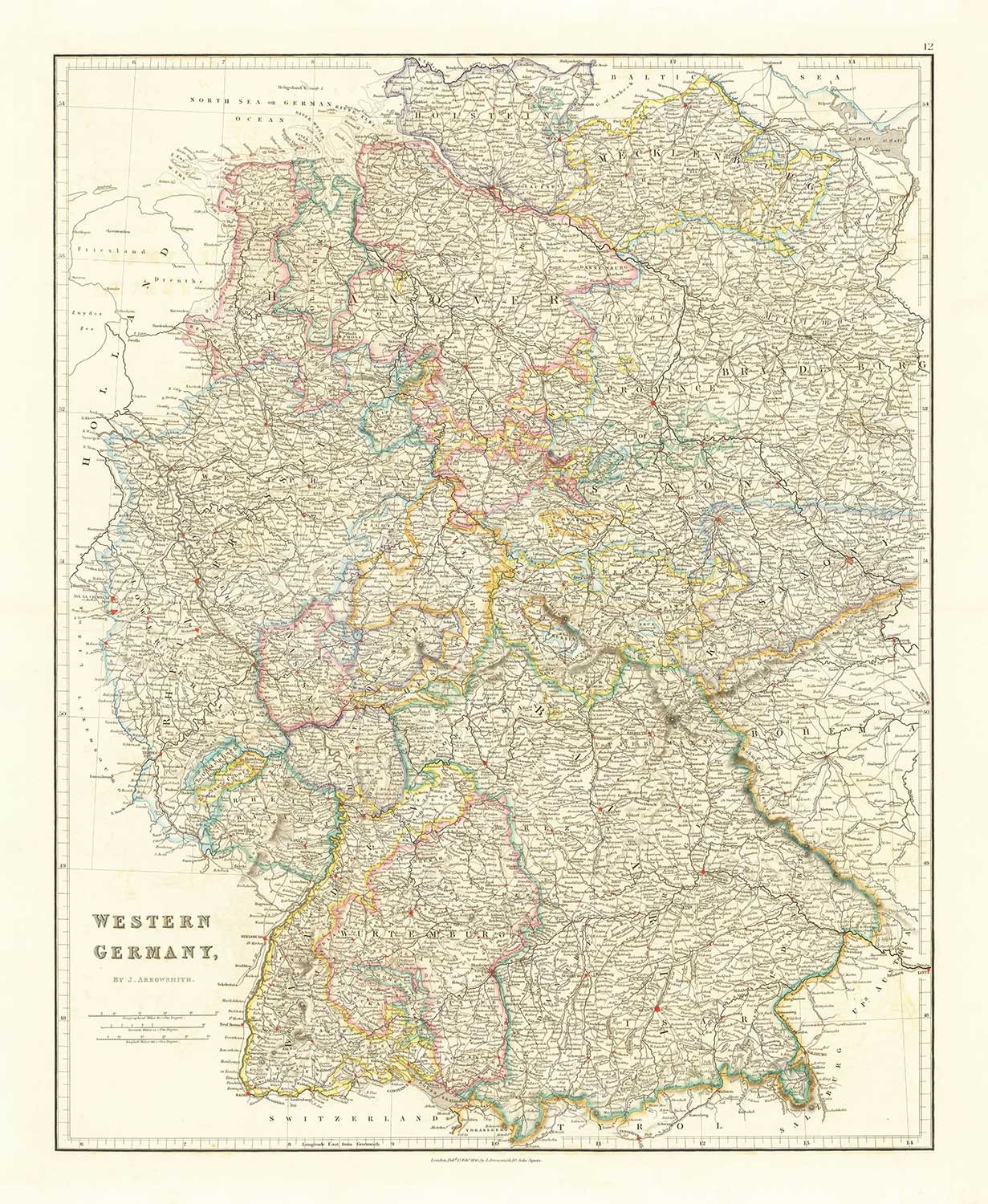 A gorgeous map of West Germany, originally published in 1832 by probably the most sought after mapmaker of the mid-19th century, John Arrowsmith.