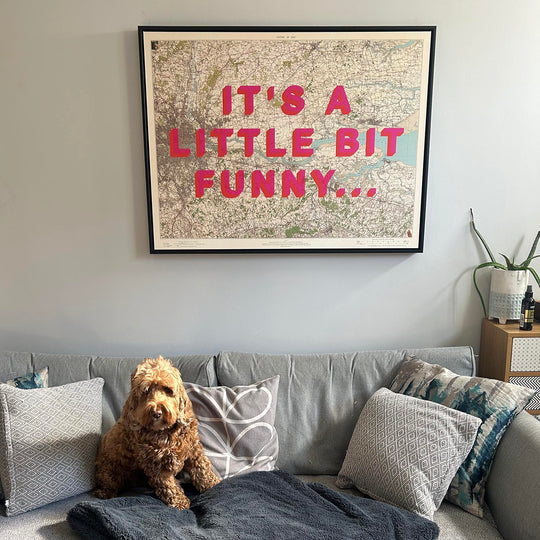 This is a fully customised map, with text printed over the top of the map in a screenprinting style.