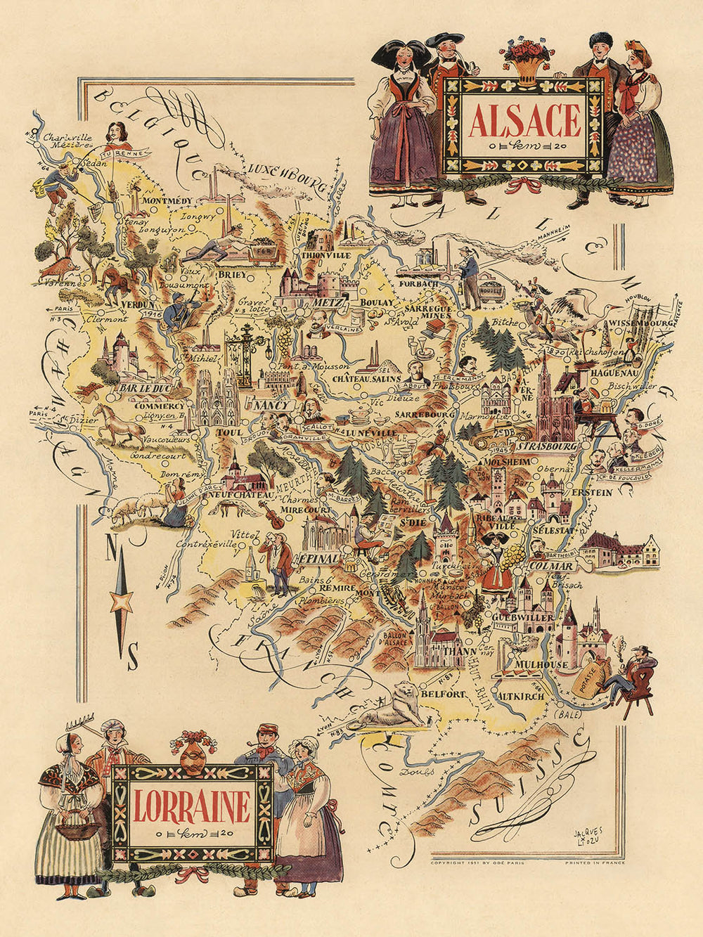 This map is more than a historical document; it is a celebration of the rich cultural tapestry of Alsace and Lorraine. Jacques Liozu's attention to detail and artistic flair make this map a valuable addition to any collection, offering a unique glimpse into the past and a deeper understanding of these fascinating regions. Whether you are a history enthusiast, a lover of fine art, or a discerning collector, this map is sure to captivate and inspire.
