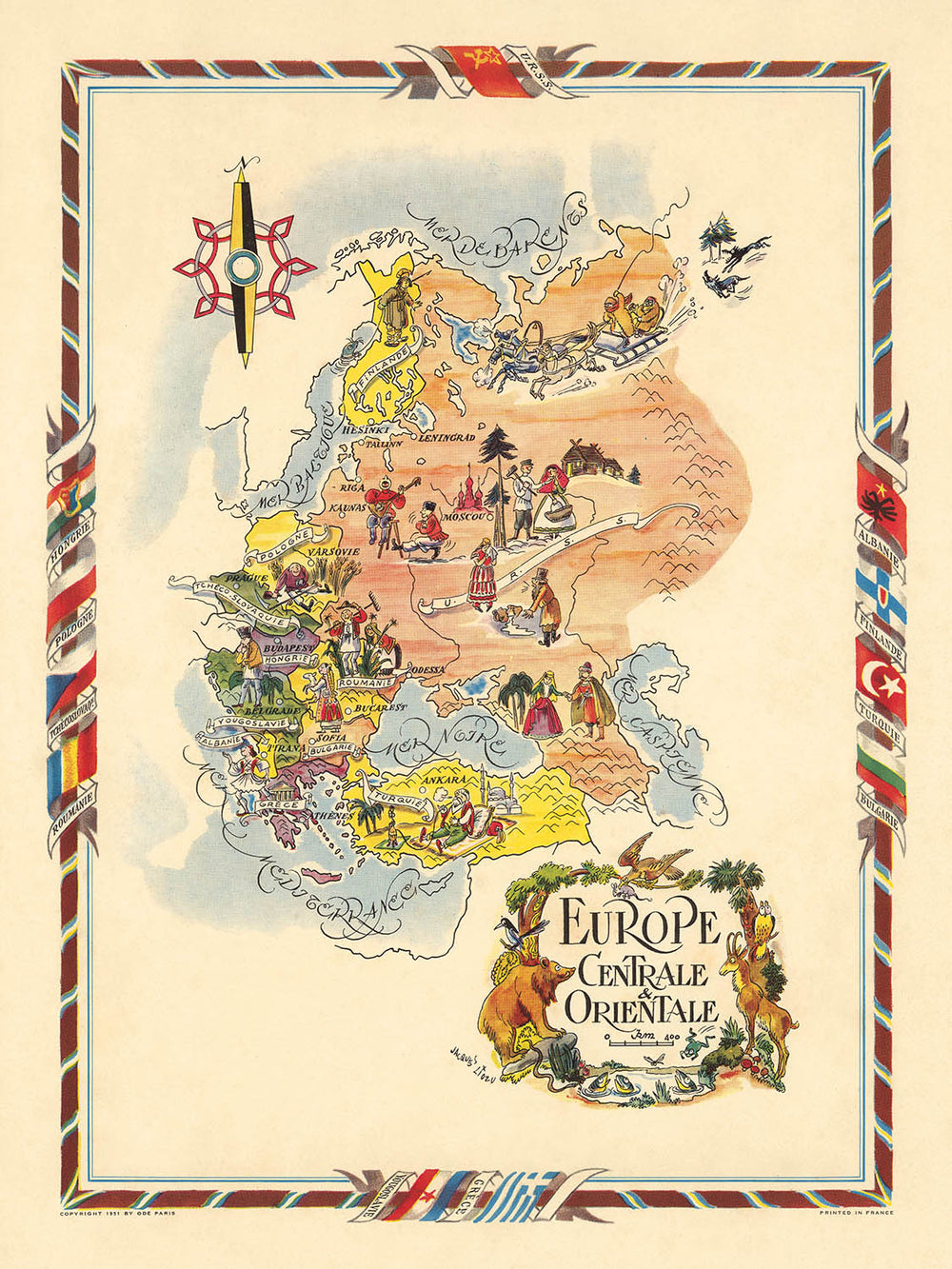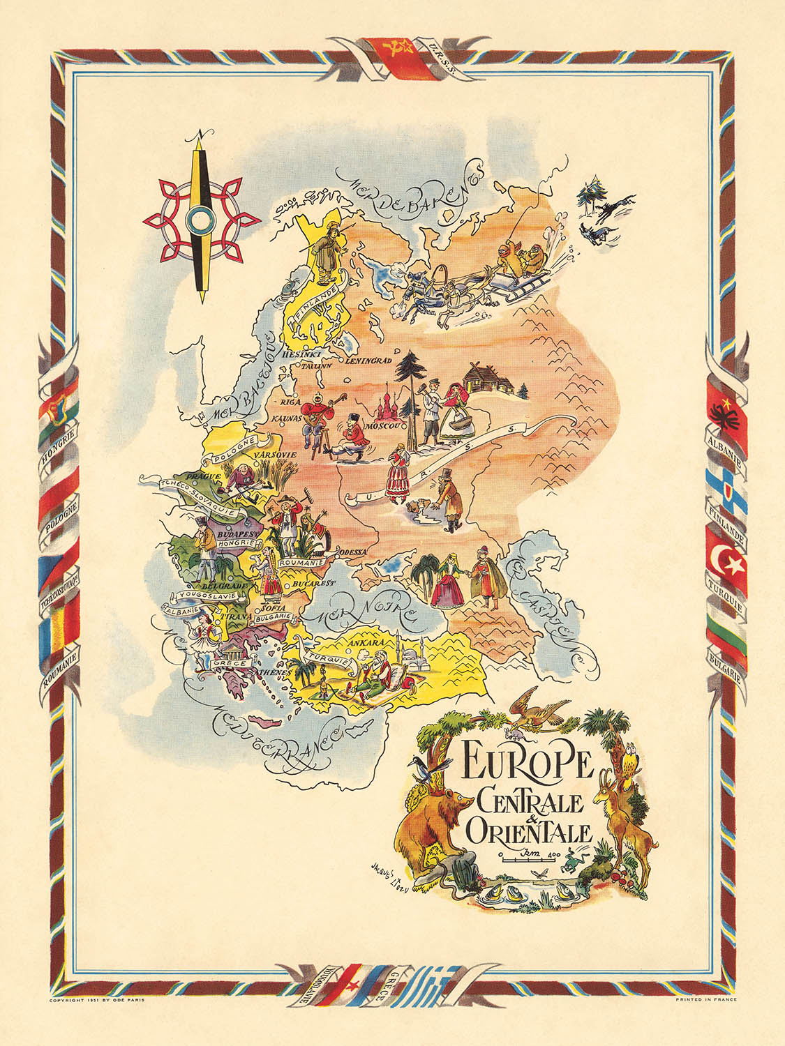 Old Pictorial Map of Central and Eastern Europe by Liozu, 1951: Post-WWII, USSR, Turkey