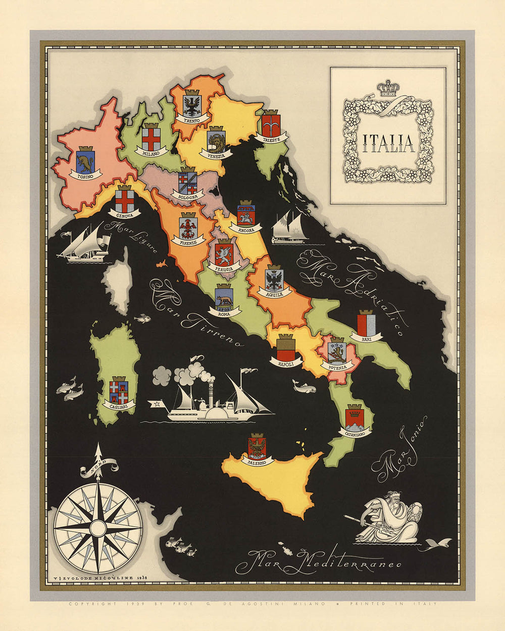 This 1938 map of Italy’s Regional Capitals, originally published by the Italian cartographic company, Istituto Geografico De Agostini, is a beautiful and informative piece of historical cartography. The map is a vibrant and colorful depiction of Italy, with each of the country’s regions clearly delineated and labeled in different colors. The only labvels on the map are the capital cities of each region. The coat of arms for each regional capital city is also included, adding an extra layer of visual interest to the map.