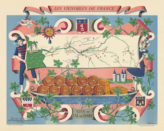 The map is framed by a rich tapestry of decorative elements, including a compass rose, clusters of grapes on the vine, a sailing vessel, and a picturesque chateau. These embellishments not only enhance the map's aesthetic appeal but also provide a glimpse into the cultural and historical context of the Loire Valley. The central illustration of barrels of wine being transported by boat underscores the region's long-standing tradition of viticulture and the importance of the Loire River as a conduit for trade and commerce.
