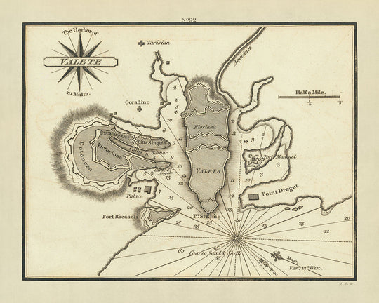 This map is not only a navigational tool but also a historical document that captures the essence of Valletta’s maritime significance. The inclusion of soundings and navigational aids like compass roses and water channels underscores its utility for sailors of the time. Moreover, the detailed representation of coastal towns and harbors around Valletta, such as Floriana and Cospicua, provides a comprehensive view of the area's urban and maritime configuration during a pivotal era in Mediterranean history.