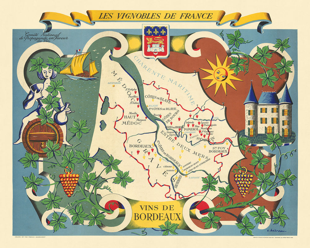 Remy Hetreau, renowned for his etchings, engravings, and illustrations, brings his artistic prowess to this map, creating a visual feast that is both informative and aesthetically pleasing. Known for his designs for Haviland Limoges china and murals at prestigious locations like the Maison de l'Amerique Latine in Paris, Hetreau's diverse artistic background is evident in the map's intricate details and elegant composition. His ability to blend art with cartography results in a map that is not only a navigational tool but also a work of art that celebrates the rich heritage of Bordeaux's wine regions.