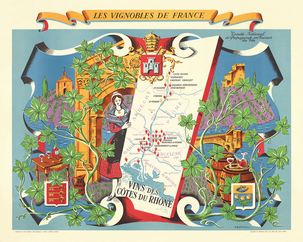 Les Vignobles De France -- Vins de Cote du Rhone, created by the esteemed French artist Remy Hetreau in 1954, is a captivating exploration of one of France's most renowned wine regions. Hetreau, celebrated for his etchings, engravings, and illustrative works, brings his unique artistic flair to this map, transforming it into a visual feast. The map was commissioned by the Comité National de Propagande en Faveur du Vin, a government agency dedicated to promoting the French wine industry, reflecting the mid-20th century efforts to boost both wine culture and tourism in France.