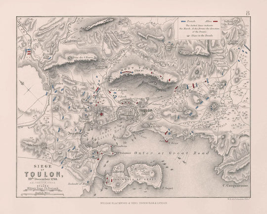 Introducing "Siege of Toulon, 19 December 1793" by A.K. Johnston, a meticulously detailed antique color lithograph created the same year as the event it depicts. This exquisite artwork presents a siege plan that intricately illustrates the positions of French and Allied forces, both on land and sea, dated December 19th. Engraved and hand-colored, it utilizes hachures to vividly depict relief and is a fascinating glimpse into historical military cartography. The map is part of an extensive atlas accompanying Sir Archibald Alison's "History of Europe," comprehensively capturing military engagements from the French Revolution to the Restoration.