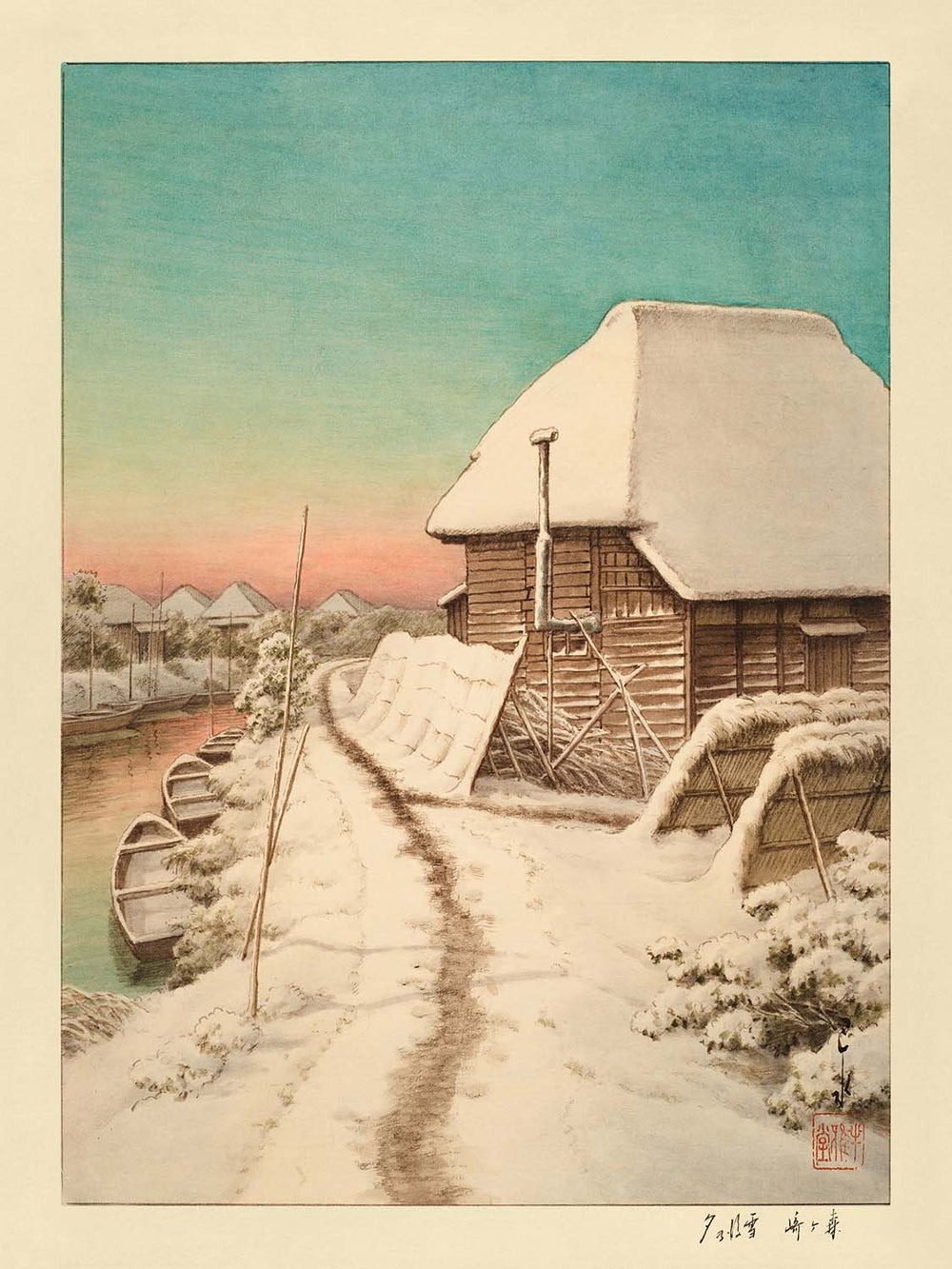 Sunset Evening Sky After Snow at Morigasaki by Hasui Kawase is a quietly luminous woodblock print from 1935 that beautifully represents the shin-hanga movement in early twentieth-century Japan. In Japanese, the artwork is known as “Morigasaki Setsugo no Yu” (森ヶ崎雪後の夕), and it captures a tranquil, snow-blanketed landscape just after a fresh snowfall, illuminated by the faint glow of sunset. Hasui Kawase, celebrated for his poetic, evocative landscapes, here invites viewers into a moment of stillness, inherited from both traditional ukiyo-e and modern atmospheric sensibilities.