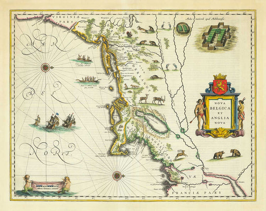 Old Map of New Netherlands and New England in 1640 by Willem Blaeu: Manhattan, Providence, New York, Boston, New Jersey