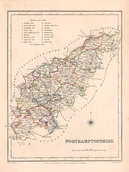 Discover the rich history of Northamptonshire brought to life with this 1844 map by renowned cartographer, Samuel Lewis. Beautifully drawn, it offers a unique glimpse into the past of one of England's most enduring regions. Highlighting a rich array of towns, cities, and settlements, the map is an intricate tapestry of Northamptonshire's history and heritage, showcasing where many of today's bustling towns and cities first began. Delight in the historical place names that mark locations familiar today; yet, be prepared to not find some modern cities, or excitingly, discover them labelled under their former names.