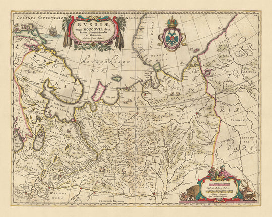 Immerse yourself in the rich history and geography of Northern and Eastern Russia with this detailed map, crafted by Nicolaes Visscher II in 1690. Titled 'Russiae vulgo Moscovia dictae, partes septentrionalis et orientalis', which translates to 'Commonly called Russia, the northern and eastern parts', this map provides an in-depth look at the political and geographical divisions of the region during the late 17th century.