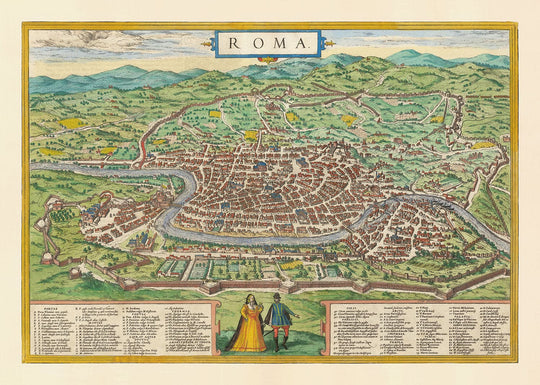 Published in 1572 by Georg Braun and Frans Hogenberg, this is the oldest full, birds eye map of Rome. If Shakespeare ever visited Rome, this is what it would've looked like. This map was first published in Civitates Orbis Terrarum - the Cities of the World - which was a cartographical masterpiece featuring 546 maps.