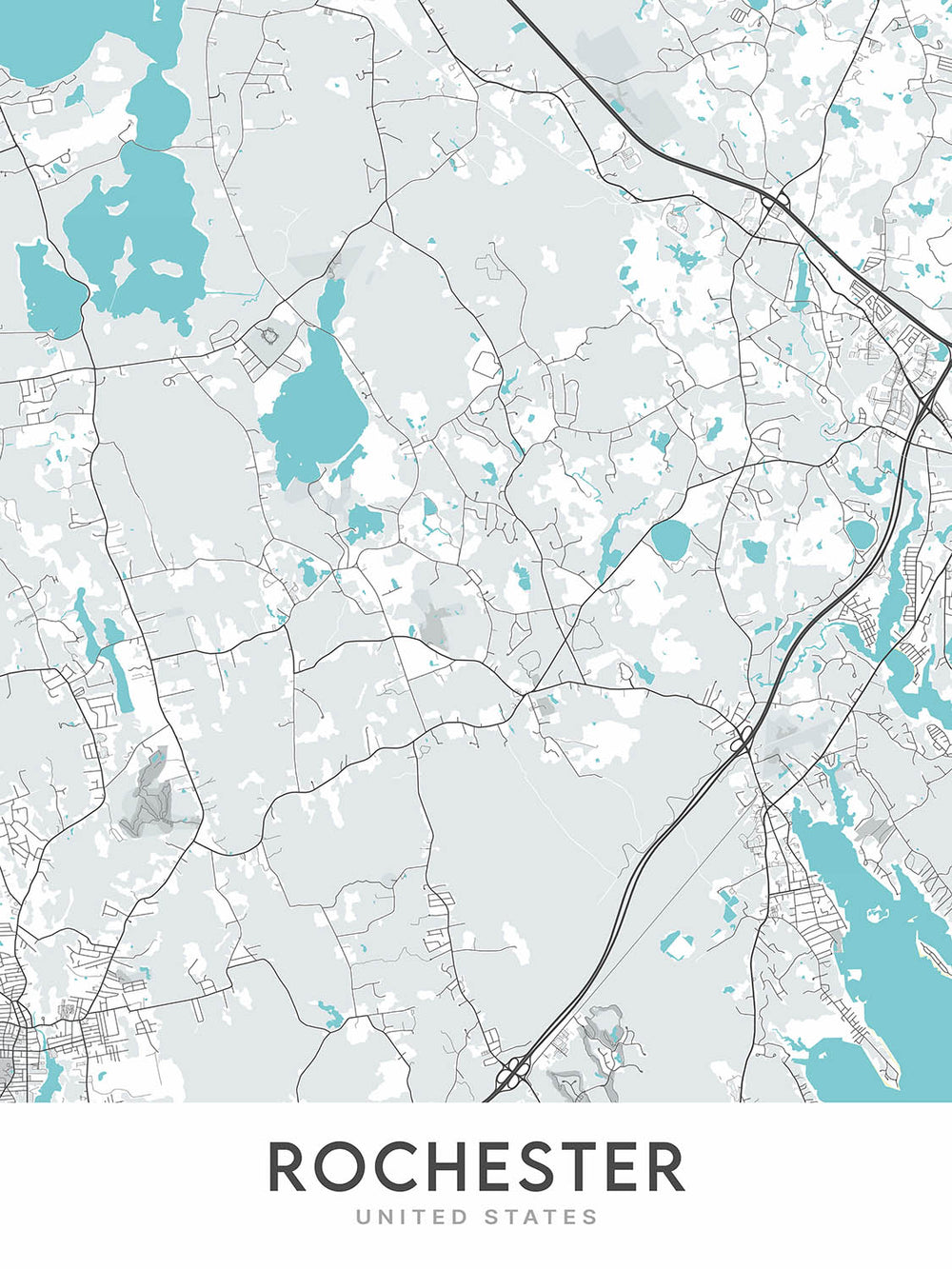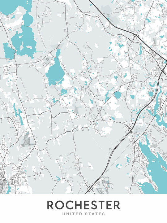 This original creation by The Unique Maps Co. features unique cartography, modern design and unique colourways. The map focuses on the city of Rochester and its surrounding areas, including the towns of Marion, Mattapoisett, Acushnet and Fairhaven. The map also includes major roads such as Route 28, Route 105, Route 6 and Route 18, as well as routes such as I-195, MA-24 and MA-139. Highways featured on the map include US-6 and US-44.