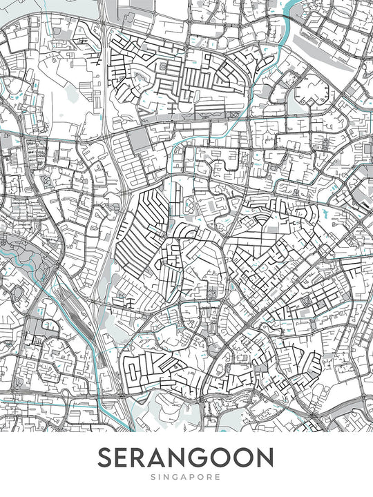 This map serves as an exceptional piece of interior art, ideal for those looking to bring a touch of urban sophistication to their living spaces. Its modern design and elegant color palette ensure that it complements a wide range of interior decors, from the sleek and contemporary to the more eclectic and vibrant setups. Whether framed and hung in a prominent location or used as a refined accent piece, the "Serangoon" map melds artistic expression with urban exploration, offering a unique and stylish way to celebrate the complexity and beauty of urban layouts.