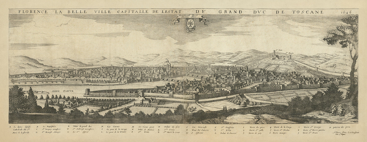 "Florence La Belle Ville Capitalle De L Estat De Grand Duc de Toscane," crafted by the esteemed Jean Boisseau in 1648, is a captivating birdseye view of Florence, Italy. This rare and detailed map provides a panoramic glimpse into the heart of Tuscany during the mid-17th century. Boisseau, a renowned French engraver and mapmaker, has masterfully captured the essence of Florence, highlighting its architectural grandeur and the intricate urban layout that defines this historic city.