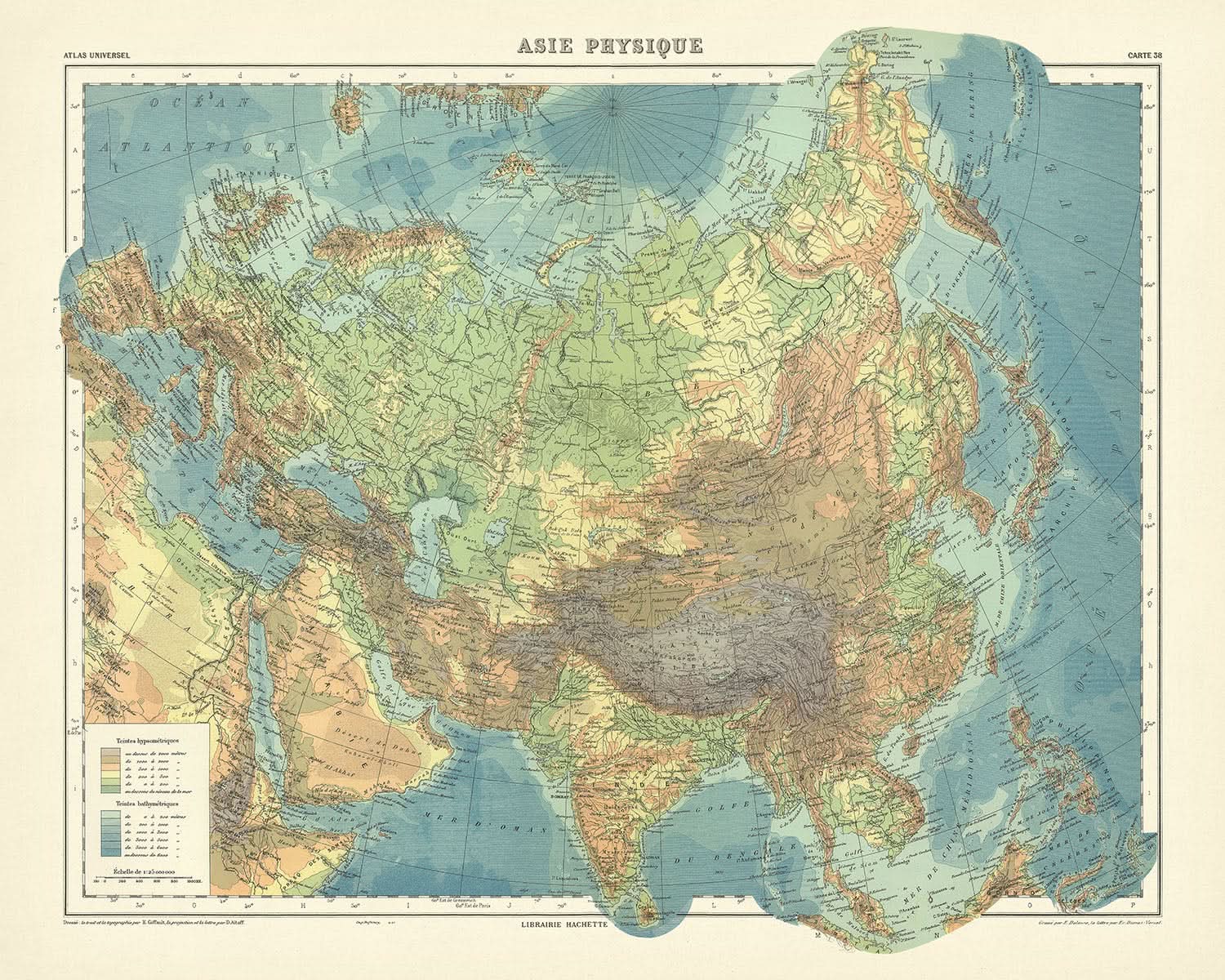 Step into the world of early 20th-century cartography with the exquisite "Asie Physique," a masterful creation by the renowned mapmaker Schrader, published in 1931 by Librairie Hachette. This map captures the essence of Asia's diverse physical geography, showcasing the continent's varied terrain with remarkable precision and artistry. Schrader's work reflects a deep understanding of the region's topographical features, providing a window into the geographical knowledge of the time. This map is not just a representation of landforms; it is a testament to the meticulous craftsmanship and dedication of its creator.