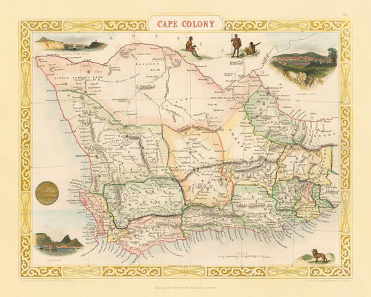 John Tallis, celebrated as one of the last great decorative mapmakers, imbued his creations with both scientific precision and artistic flourish. His maps are prized for their elegant borders and evocative vignettes, and “Cape Colony” is no exception. Here, Tallis’s artistry shines through in the beautifully rendered illustrations of Cape Town, Graham Town, and the Entrance to the Knysna—each scene a glimpse into the landscapes and settlements that defined the region. These vignettes, carefully engraved and hand-colored, transform the map into a visual journey through the Cape’s storied past.