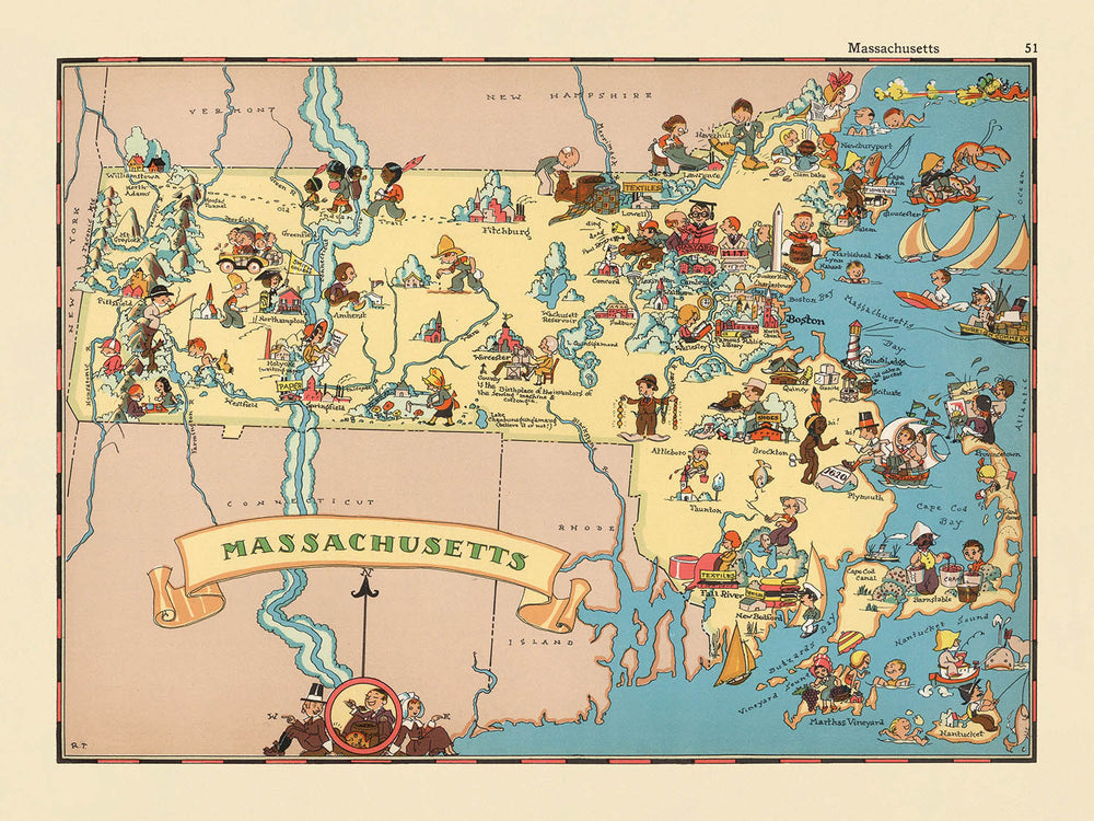 Pictorial Map of Massachusetts by Ruth Taylor White, 1935: Boston, Cape Cod, Harvard, Pilgrims, Maritime Heritage