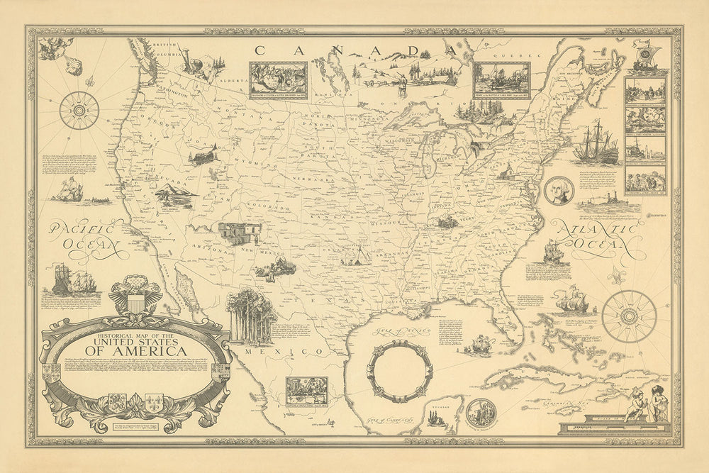 Ernest Clegg's meticulous craftsmanship is evident in every corner of this map. His illustrations bring to life significant historical events and landmarks, from the bustling streets of New York to the serene landscapes of the Pacific Northwest. The map not only charts the physical terrain of the United States but also narrates its storied past through vignettes and decorative elements. Clegg's ability to merge cartographic precision with artistic flair results in a map that is as informative as it is visually stunning.