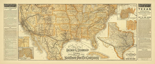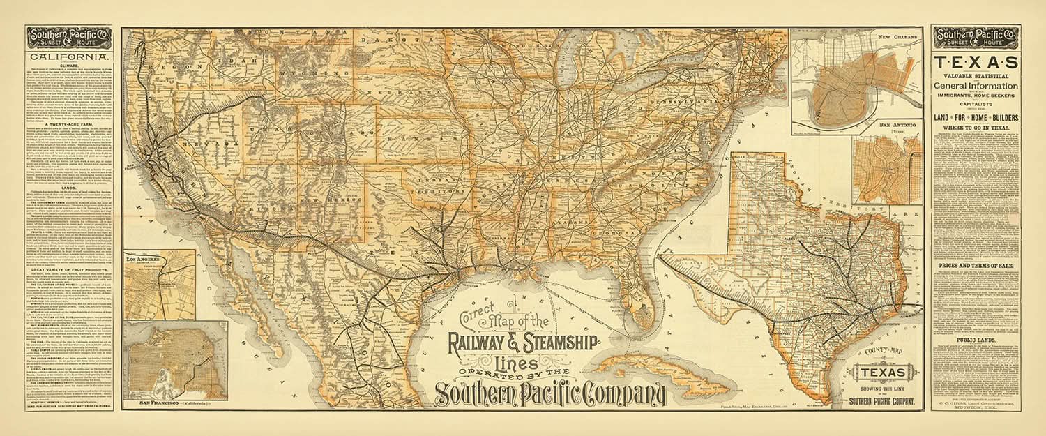 The map's detailed insets of Los Angeles, San Francisco, San Antonio, and New Orleans provide a closer look at key urban centers during this transformative period. These insets capture the essence of each city, from the bustling Union Depot in Los Angeles to the intricate street grids of San Francisco. The inclusion of a comprehensive map of Texas further underscores the strategic importance of this region in the Southern Pacific's expansive network.