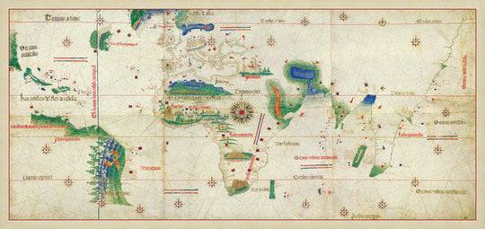 The Cantino Planisphere, crafted in 1502 by an anonymous Portuguese cartographer, is a masterpiece of cartographic history. This exquisite map captures the world as it was newly revealed to European explorers at the dawn of the Age of Discovery. It reflects the ambitious voyages that expanded the horizons of Europe, showcasing newly discovered lands and sea routes to the Americas, Africa, and India. The map is named after Alberto Cantino, an Italian diplomat who acquired it, and it remains one of the most precious cartographic documents of its time.