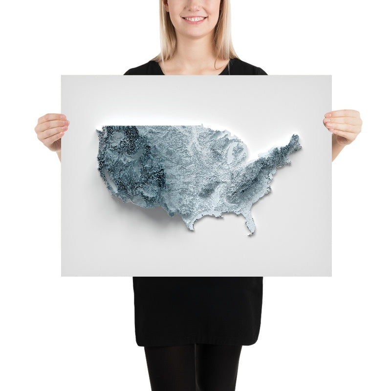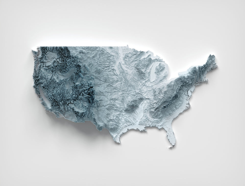 This is a minimalist topographical relief map of the United States, created by The Unique Maps Co. and refined with our trademarked Unique 3D process. There are no labels, no roads, and no towns — just landforms. With raking light that sharpens ridgelines and lets lowlands fall gently into shadow, the country’s structure comes alive: peaks stand crisp, valleys pool with depth, and the great sweeps of plains and plateaus read at a glance.