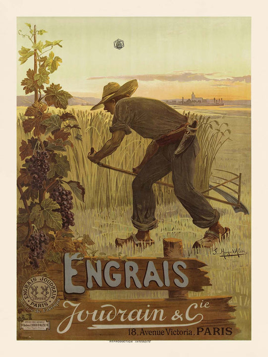 Engrais Joudrain & Cie by Frédéric Hugo d’Alési (1900) captures the Belle Époque romance of rural France through the lens of early industrial advertising. Created by one of the era’s most admired poster artists, this composition promotes a French fertilizer house while evoking the abundance and optimism of turn‑of‑the‑century agriculture. In the original lithograph, a pale, cream-toned header gives way to deeper, earthy tones below, and the company name stands out boldly—an elegant, eye‑catching balance of typographic swagger and pastoral imagery that speaks to both design lovers and Francophiles.