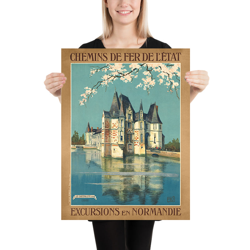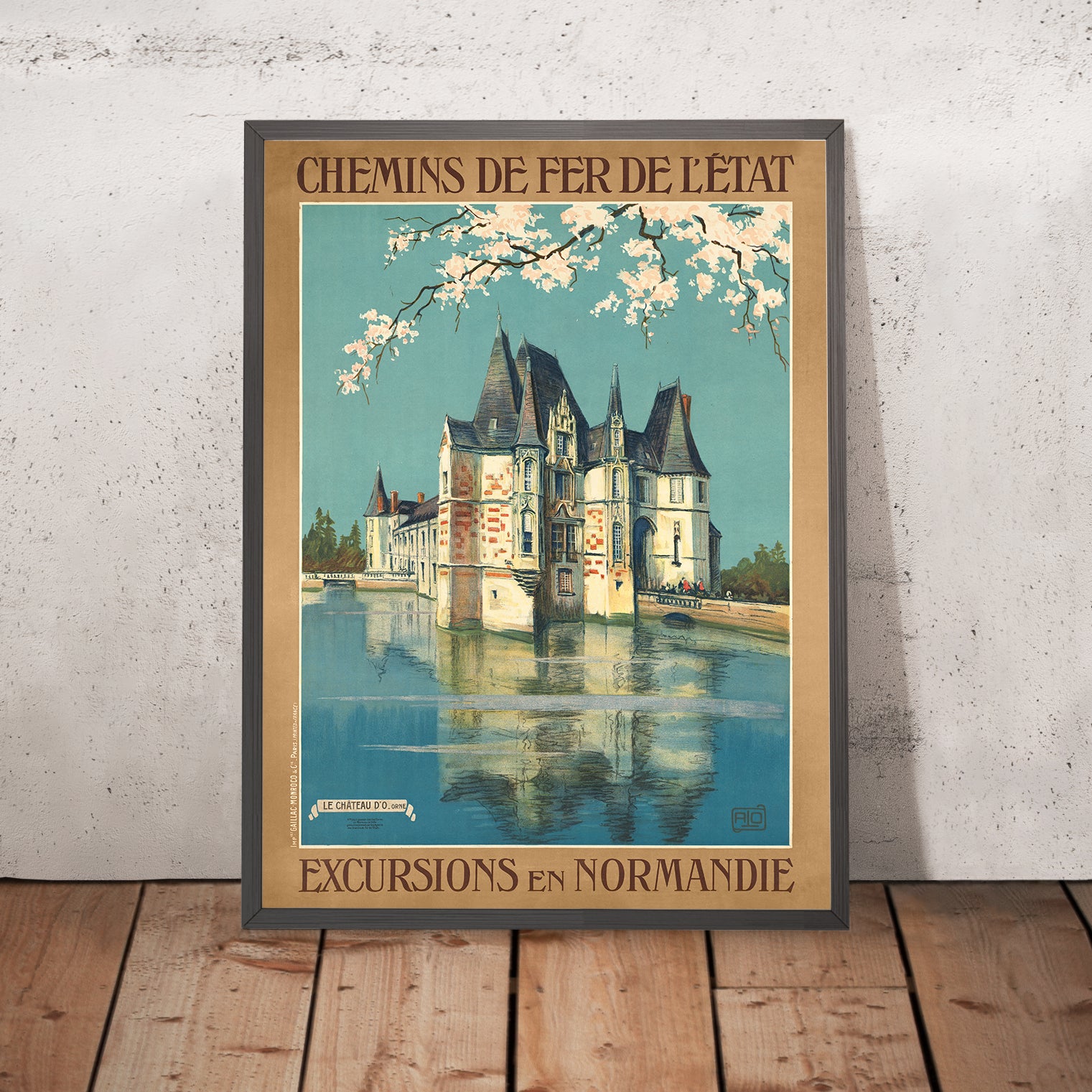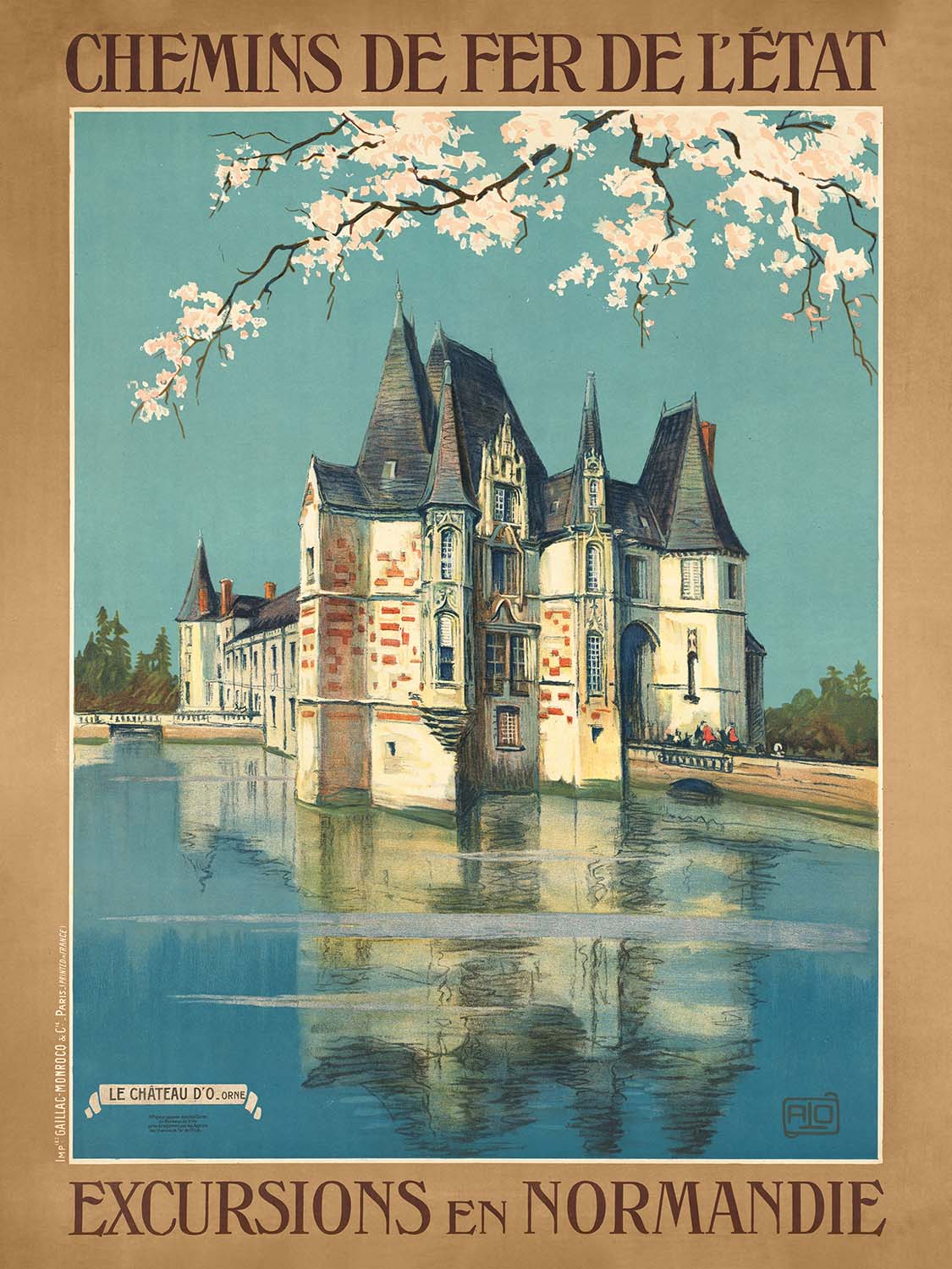 Why Normandy: the region’s blend of medieval architecture, serene rivers, and dramatic coastline made it a natural muse for travel advertising. Excursions en Normandie conjures the pleasures of day trips—strolling château grounds, lingering by calm waters, and savoring the slower rhythm of provincial France. For anyone who has wandered Normandy’s lanes or dreamed of its apple orchards and half-timbered towns, this image captures the spirit of going “just a little farther” by rail to find beauty.