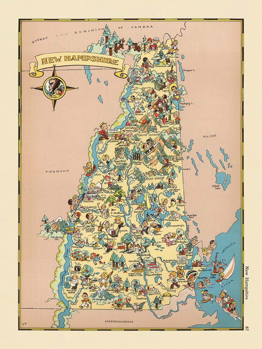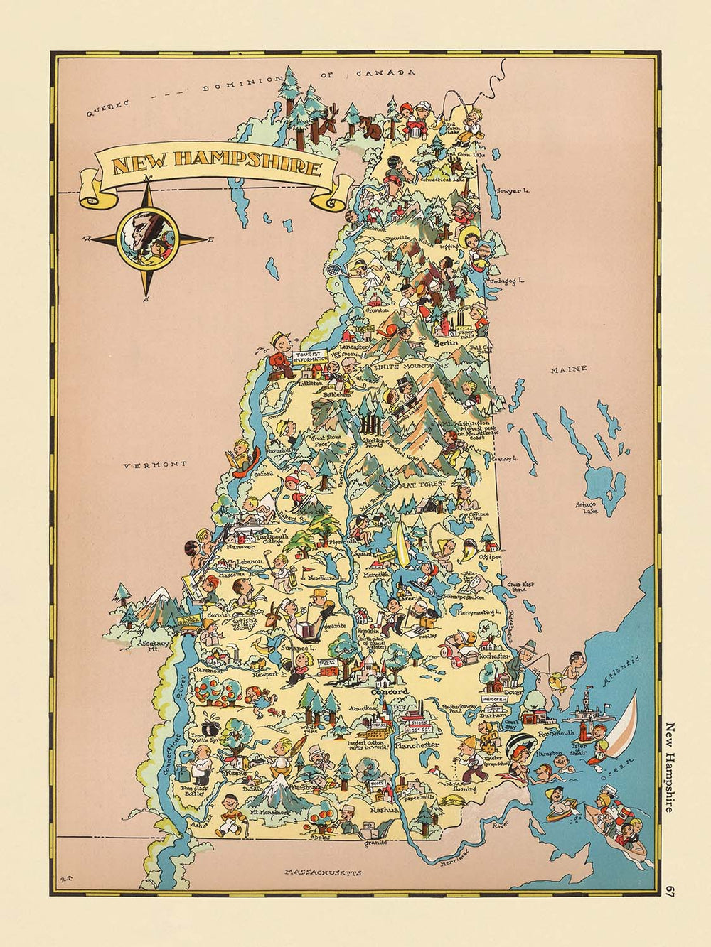 Pictorial Map of New Hampshire by Ruth Taylor White, 1935: Manchester, Nashua, Concord, Lakes, Mountains